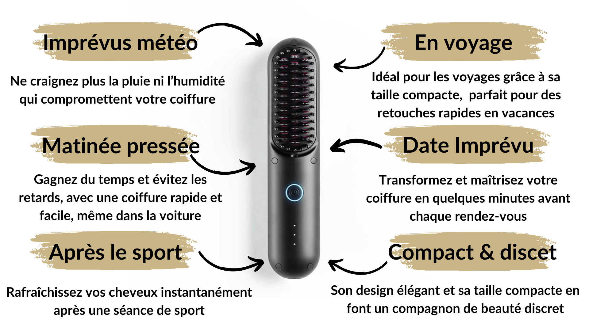 Produit incroyable ! Il est petit et léger, se glisse facilement dans mon sac. Mes cheveux frisottent souvent avec la pluie et l’humidité, mais avec Brusheo, je peux les lisser à tout moment sans avoir besoin de rentrer chez moi.