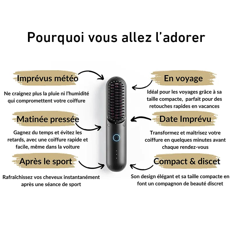 Produit incroyable ! Il est petit et léger, se glisse facilement dans mon sac. Mes cheveux frisottent souvent avec la pluie et l’humidité, mais avec Brusheo, je peux les lisser à tout moment sans avoir besoin de rentrer chez moi.